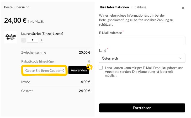 Step #05 Enter your discount code and click “Apply". After that, you can enter your email address and continue with the checkout.