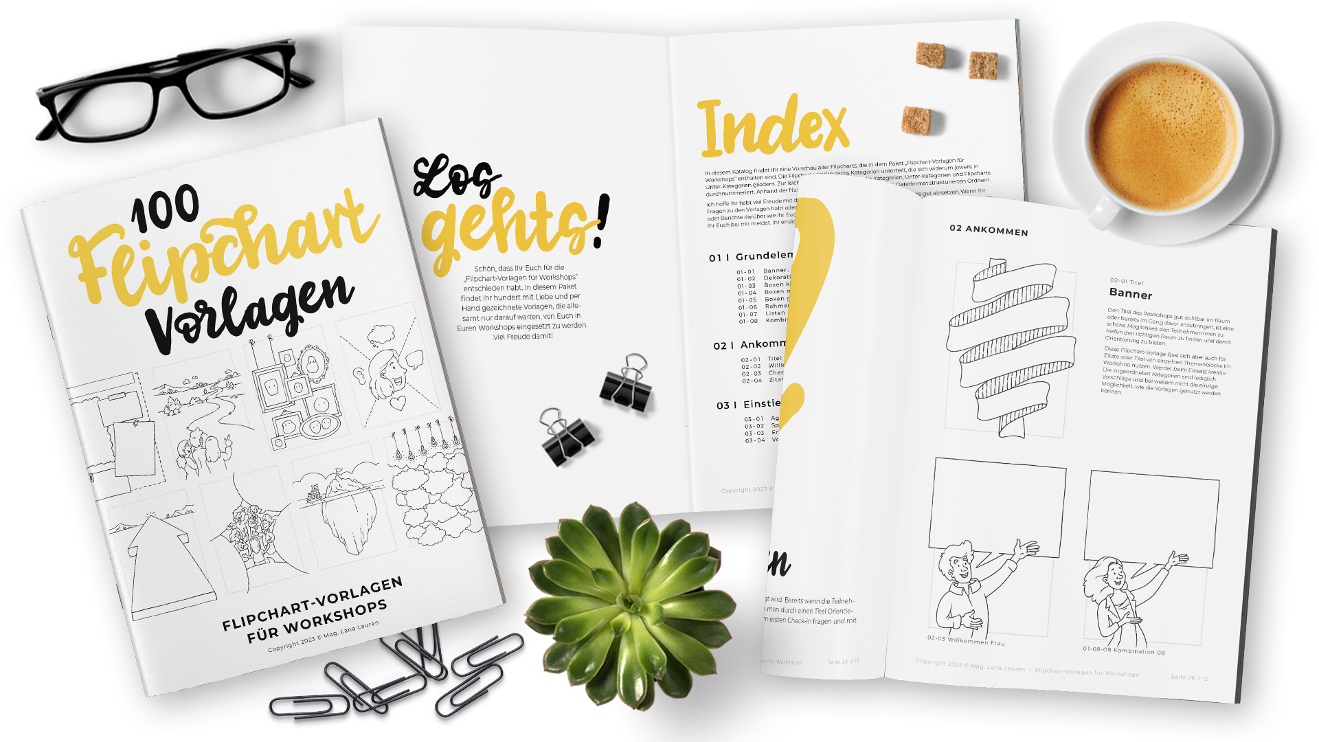 Each section offers ready-to-use designs that help you structure your workshop, guide participants smoothly through the process, and create visual highlights that leave a lasting impression - even if drawing isn’t your thing.